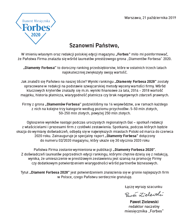 Miło nam poinformować, że firma DELTA Zbigniew Różycki została laureatem prestiżowej nagrody „Diamenty Forbesa” 2020.